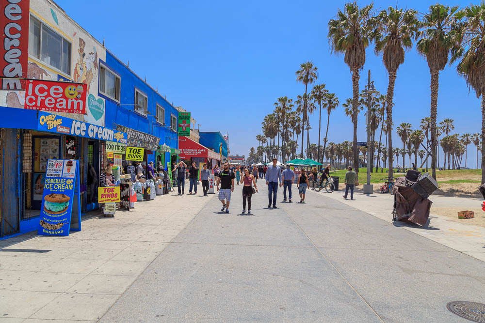 Dann ging es am Ocean Front Walk weiter. Das ist der Weg zwischen Strand und der Stadt. Was man hier alles sehen und erleben kann ist unfassbar. Nicht zuletzt wegen den Leuten dort. Was in Deutschland als verrückt gilt, ist hier normal. Mir gefällts. Jeder macht das, was er gerne macht. Alles wirkt irgendwie ungezwungen. Der Himmel klarte auf und die Sonne fing an ihre Kraft zu entfalten. Durch die kühle Pazifikluft war es aber bei etwa 23°C recht erträglich.
