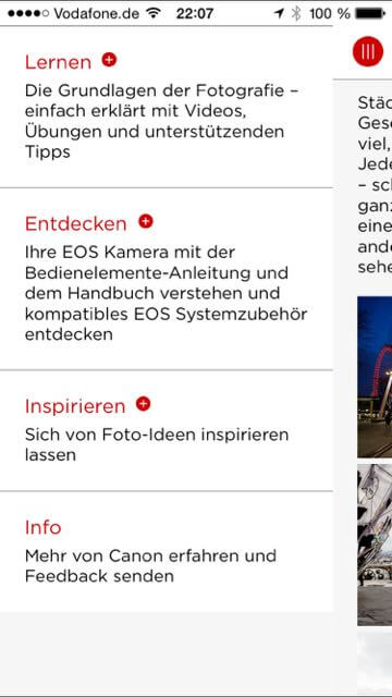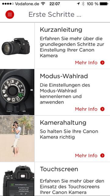 Mit der Canon EOS 1200D fing es an, dass Canon eine Art Helfer-App entwickelte, die Einsteigern der neuen EOS Kamera die Fotografie etwas näher bringen sollte. Schlecht finde ich die Idee nicht, zumal man als Neuling wirklich viel Wissen unterwegs daraus saugen kann. Außerdem sind dort auch einige Inspirationen für „Alte-Hasen“ zu finden. Mit 184 MB ist die App nicht gerade klein. Auf jeden Fall ist es eine sehr gute Alternative zum oft langweiligen Handbuch.