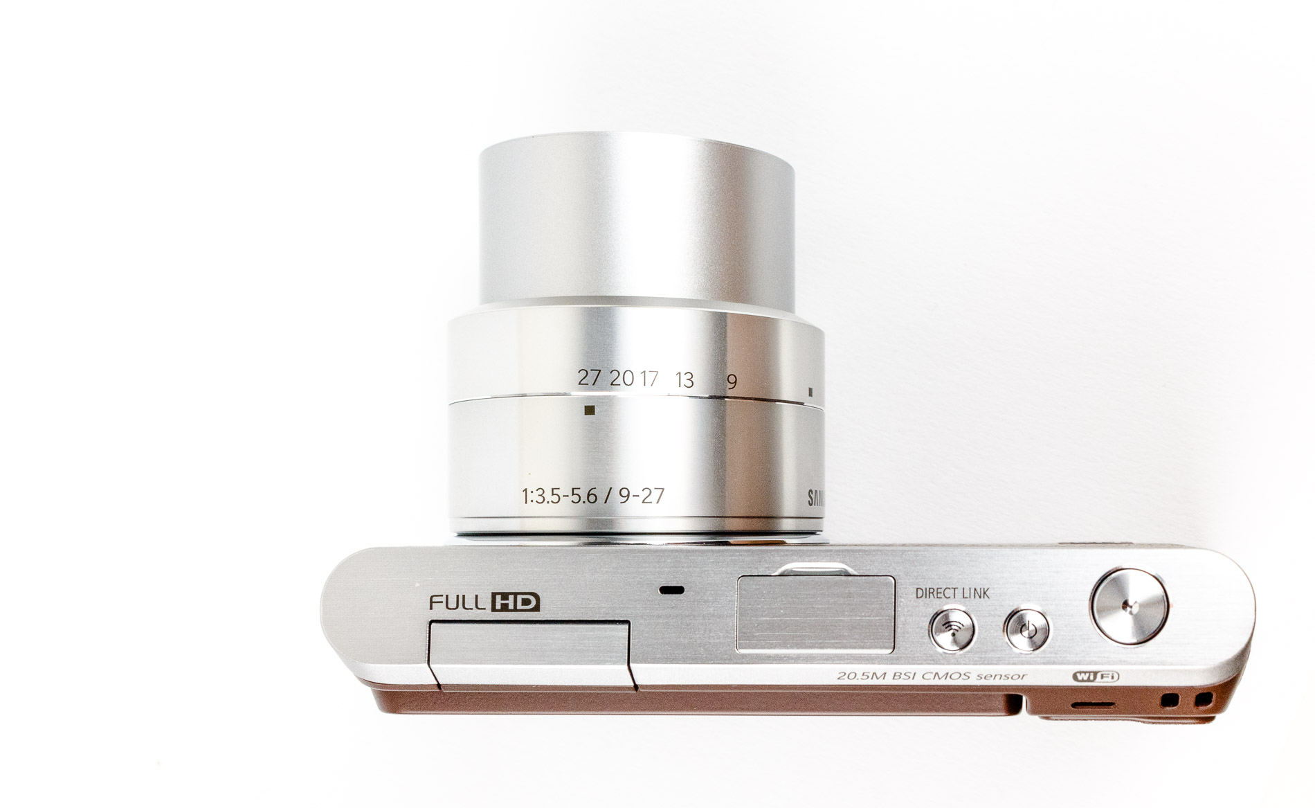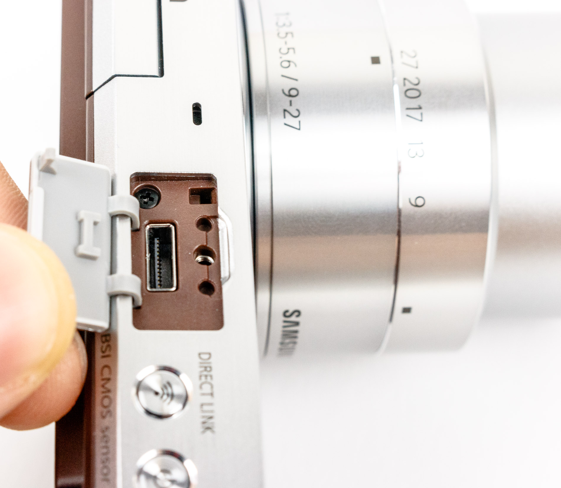 Obwohl die NX Mini bereits einen internen Blitz verbaut hat, wird trotzdem ein externer Blitz mitgeliefert. Dieser wird über den Anschluss an der Oberseite verbunden (Bild siehe oben).