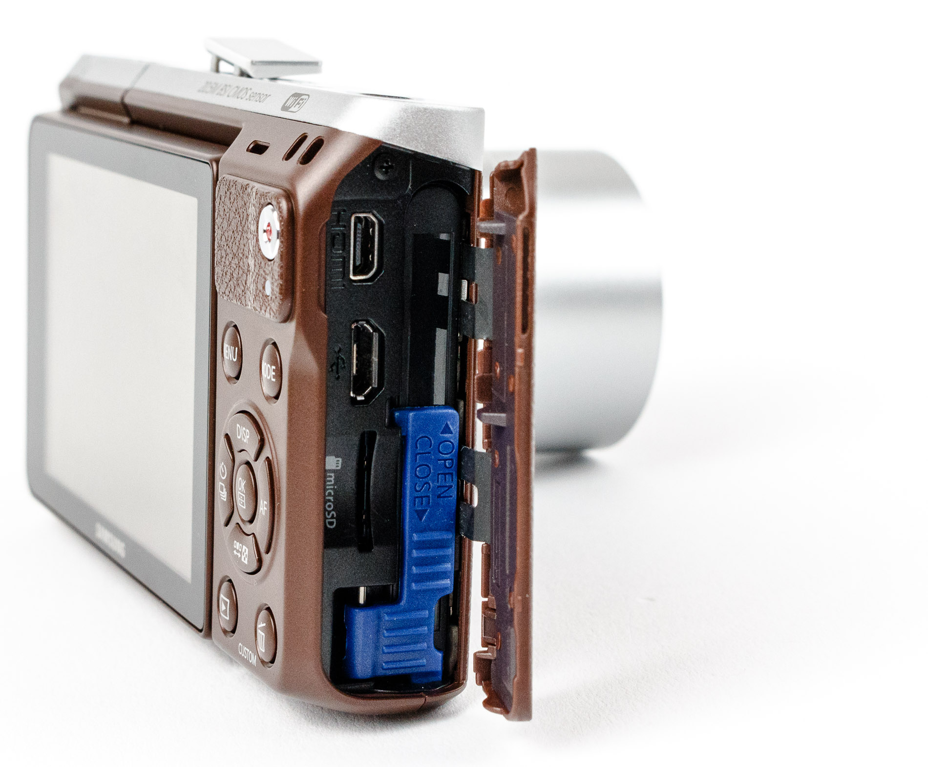 Qualitativ macht die NX Mini einen sehr guten Eindruck. Vor einiger Zeit habe ich bereits über die Samsung NX300 geschrieben, ganz ähnlich verhält es sich auch mit der NX Mini. Der Auslöser hat einen guten Druckpunkt und die Tasten auf der Rückseite sind fühlbar und haben ebenso einen guten Druckpunkt. Um die Kamera einzuschalten, muss man auch eine Taste drücken. Ein Schalter hätte mir hier etwas besser gefallen. Auf der rechten Seite befindet sich eine Klappe unter der sich der Speicherkartensteckplatz, der riesige Akku, HDMI- und USB-Anschluss verbergen. Alles wirkt sehr aufgeräumt. Das Display ist gut, könnte aber auch etwas höher aufgelöst sein. Das Touchdisplay funktioniert gut, wobei man die Kamera aufgrund des kleinen Gehäuses leider etwas wackeliger hält, so ist es zumindest mir aufgefallen. Ansonsten spricht das Display gut an und lässt sich über die mittlerweile üblichen Gesten steuern. Das Display lässt sich um ca. 180° nach oben schwenken, sodass man sich selbst im Livebild sehen und sehr gut Selfies erstellen kann. Ist die Kamera aus, so wird sie eingeschaltet, wenn man das Display nach oben bewegt. Außerdem ist die Schwenkfunktion des Displays natürlich bei Aufnahmen in bodennähe sehr praktisch.